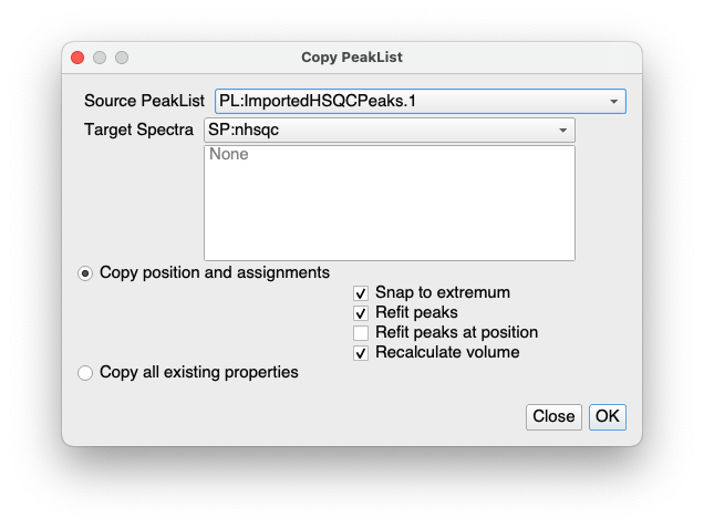 This will create a new Spectrum (called ImportedHSQCPeaks) in the sidebar. Then copy that peakList over to the HSQC spectrum you have either by dragging the peakList from the sidebar onto the spectrum in a SpectrumDisplay in the DropArea, or simply with Spectrum / Copy PeakList… or shortcut CL. This will bring up another pop-up. Make sure the correct PeakList and spectrum are selected at the top and then decide whether you want to refit the peaks or simply copy them exactly as they are and click OK.