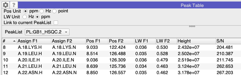 we compared linewidth between different experiments and noted that the linewidth value displayed in the peak table (LW F1 and F2) are not consistent with the circle shown for the peaks shown as “Filled line Widths”: the larger circles are showing the smaller LW.